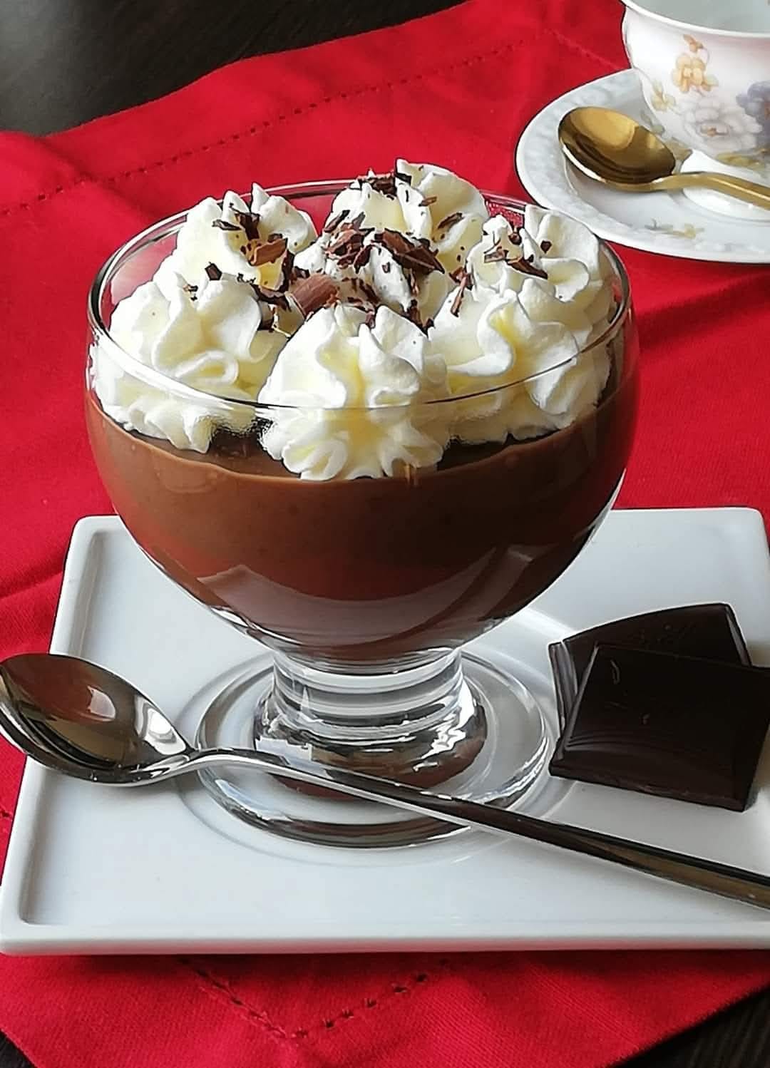 200 ml śmietanki kremówki 30 % ubić udekorować, posypać startą czekoladą.