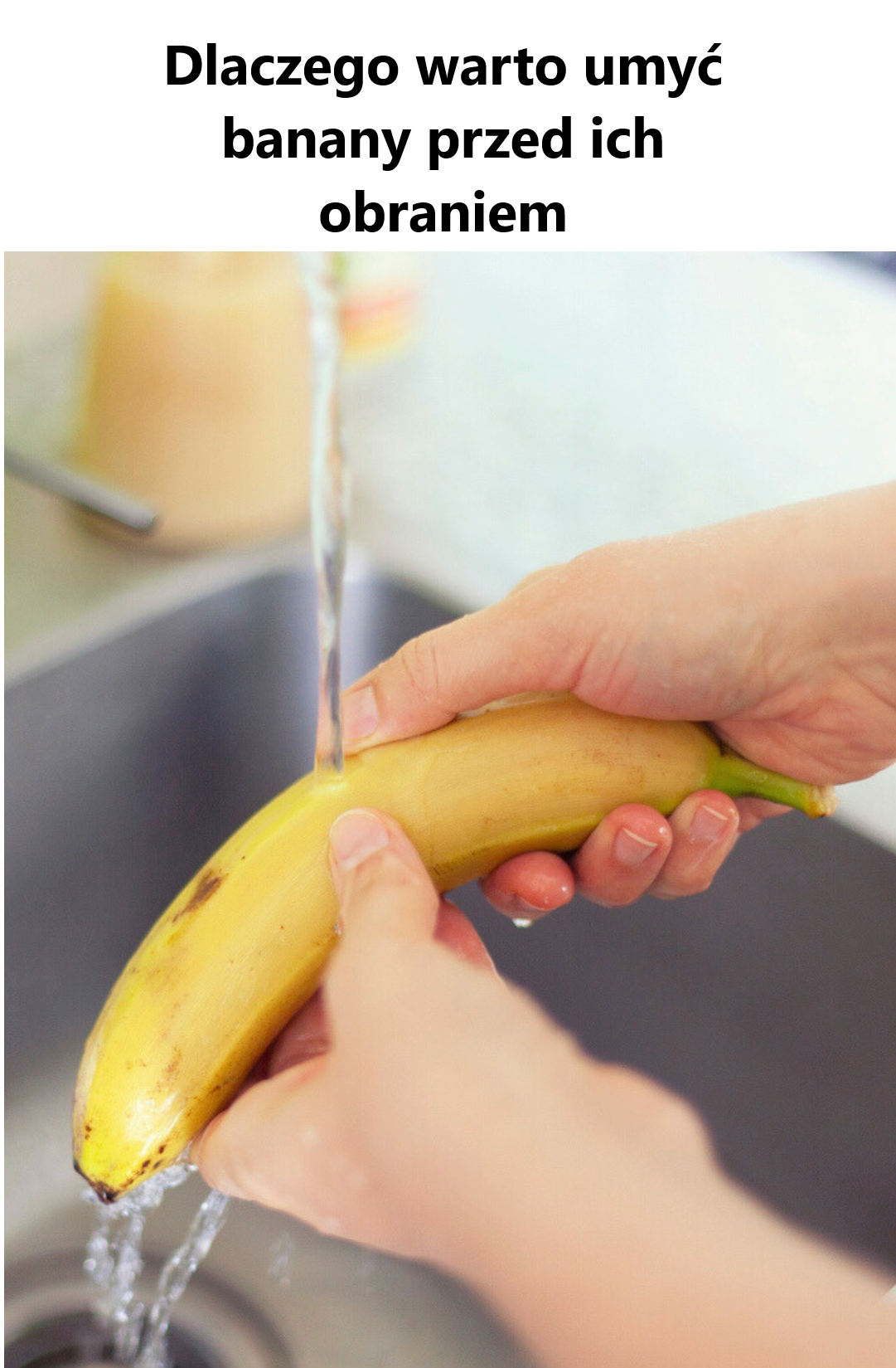 Banany pokonują duże odległości z farm do Twojej kuchni, przechodząc przez wiele rąk i środowisk. Zwiększa to prawdopodobieństwo skażenia. Szybkie opłukanie banana może pomóc zmniejszyć ryzyko przeniesienia szkodliwych bakterii na jadalną część owocu.