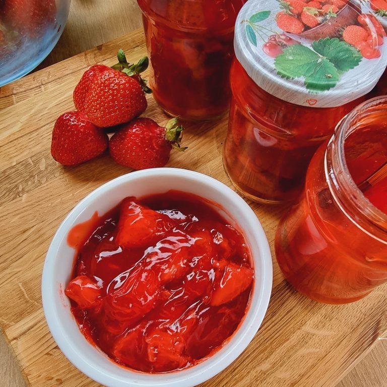 Frużelina to krótko gotowane truskawki z cukrem i dodatkiem mąki ziemniaczanej. Zawekowane idealnie sprawdzą się do deserów, ciast czy naleśników. Jest taka pyszna, że można wyjadać ją ze słoika. Polecam póki sezon truskawkowy trwa….