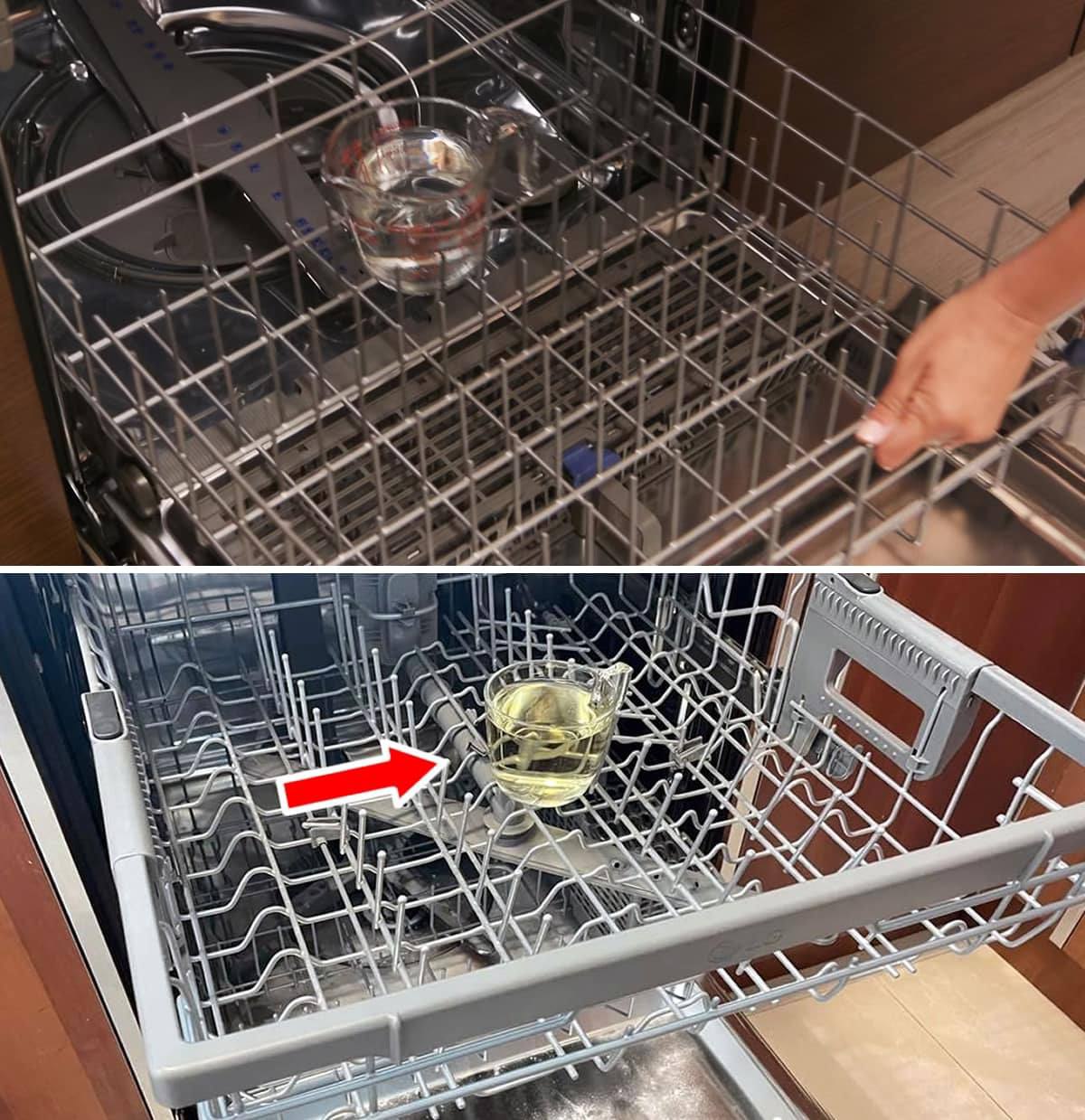 Wlej szklankę octu do pojemnika na detergenty lub postaw otwarte naczynie z octem na dolnej półce zmywarki.