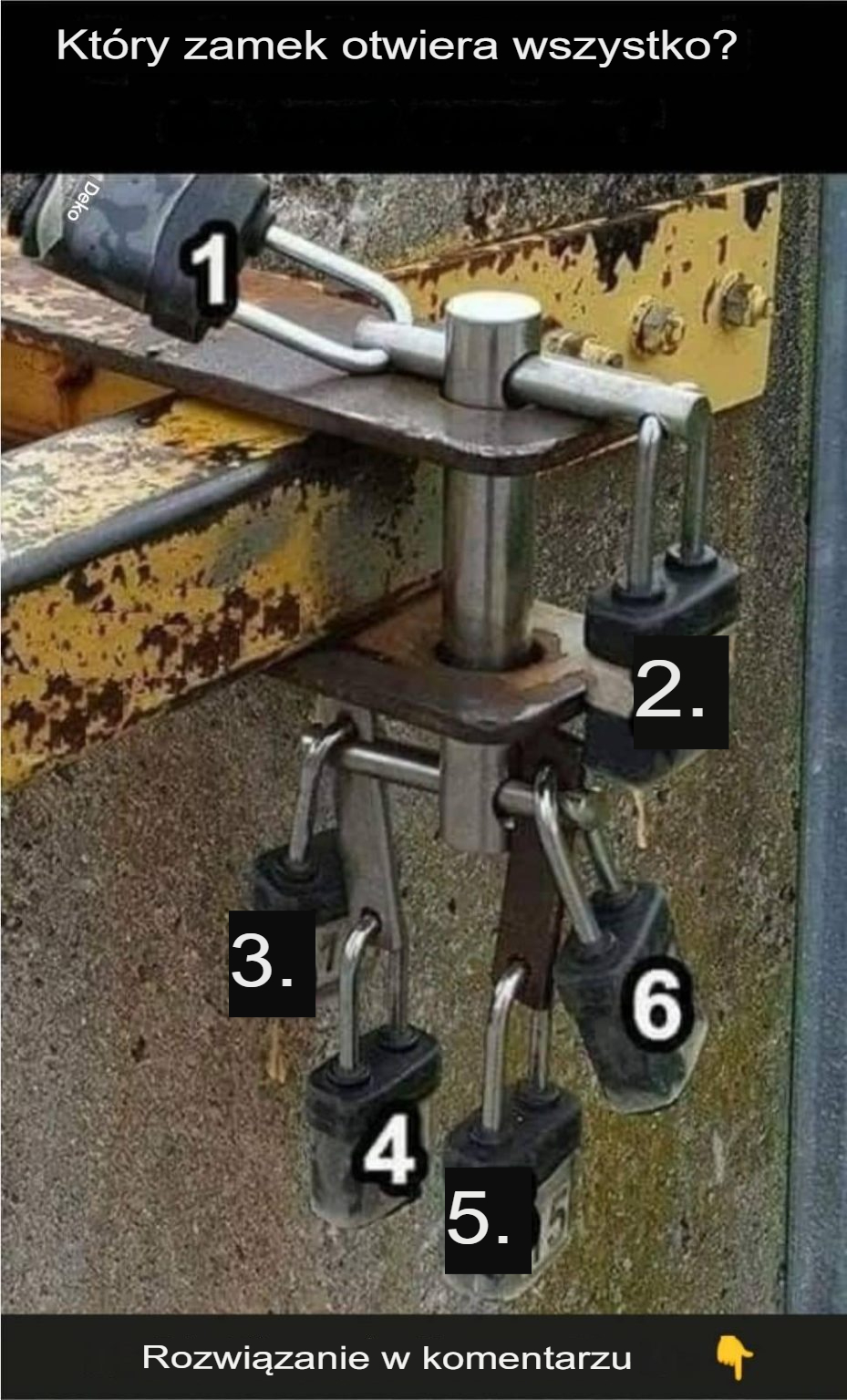 Przyjrzyjmy się bliżej obrazkowi. Widzimy sześć kłódek ponumerowanych od 1 do 6. Wszystkie te kłódki blokują blokującą metalową konstrukcję. Aby otworzyć wszystko, musisz usunąć tylko jeden element: górny (poziomy metalowy pręt, który krzyżuje się na górze).