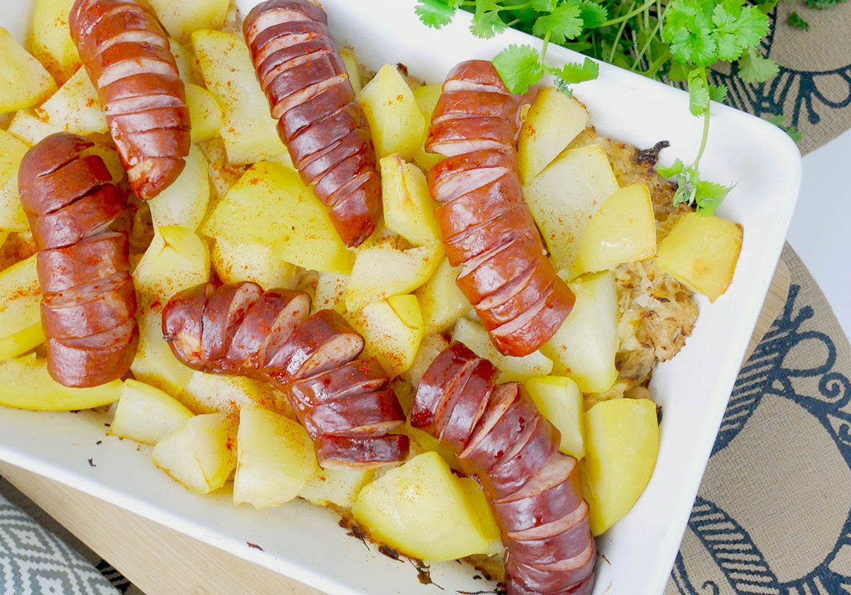 Składniki na kiełbasę zapiekaną z kiszoną kapustą i ziemniakami: