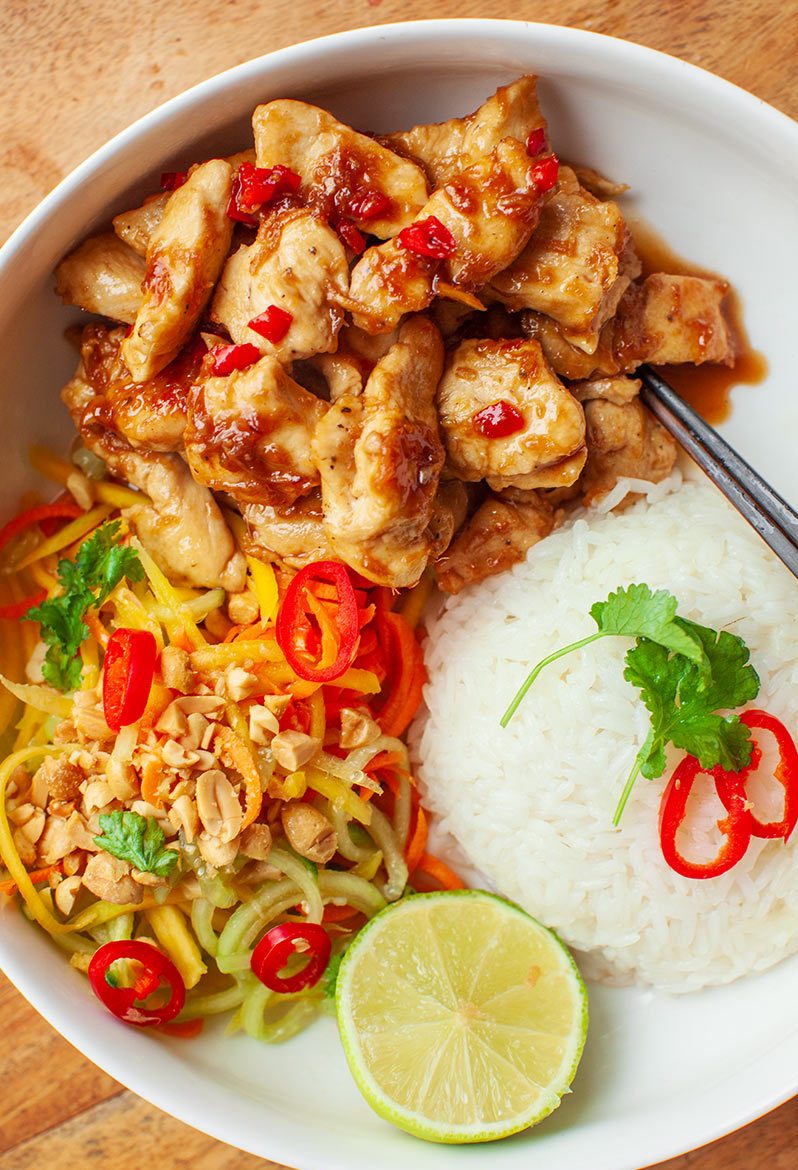 Kurczak po wietnamsku to kawałki filetu z piersi kurczaka, w azjatyckim sosie z imbirem, chili i limonką. Z dodatków polecam ryż jaśminowy oraz sałatkę z mango.