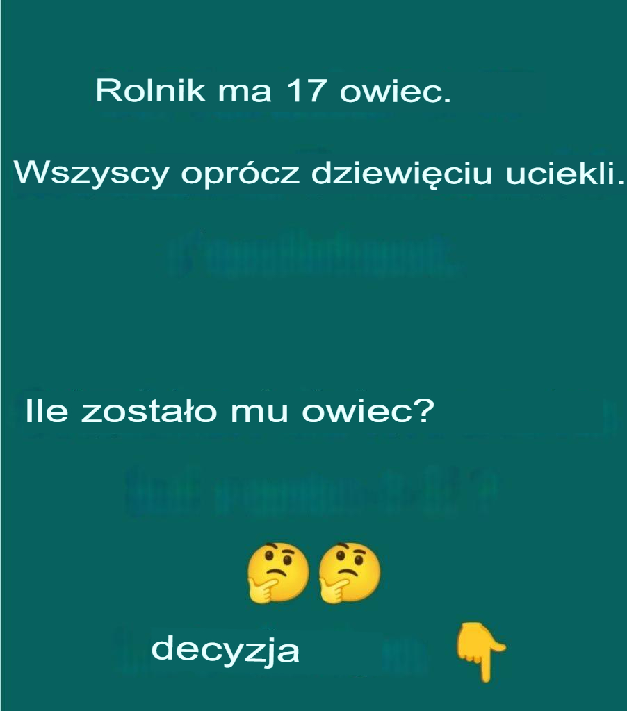 Reklama Reklama Łamigłówka matematyczna July 27, 2025 by articles articlesZagadka matematyczna: Rolnik ma 17 owiec. Wszystkie oprócz 9 uciekły. Ile owiec mu zostało? — zobacz więcej na następnej stronie Reklama Następny→ Reklama