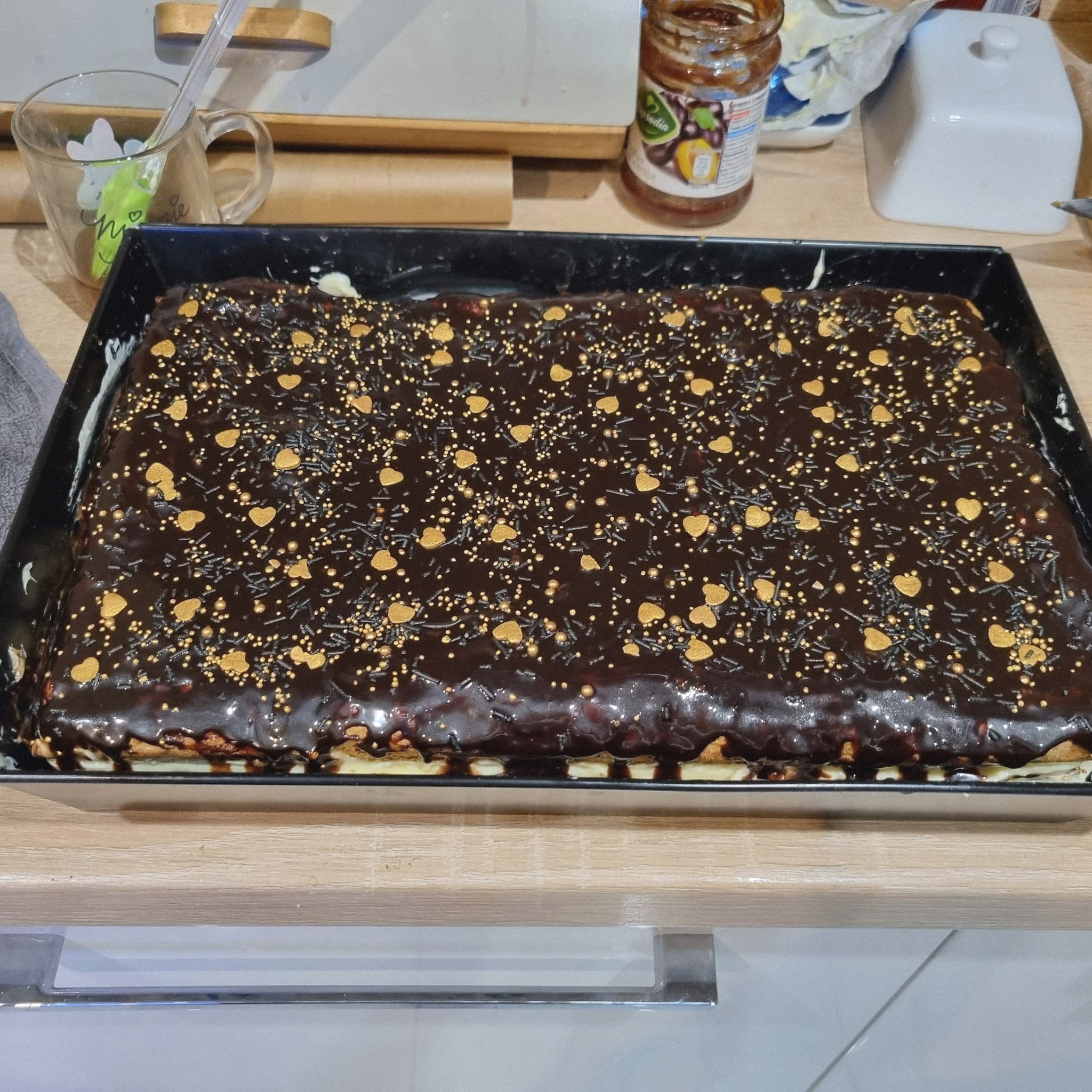 Podziel ciasto na 3 równe części. Rozwałkuj każdą na cienki placek i piecz w 180°C przez około 8-10 minut na złoty kolor. Po upieczeniu ostudź.