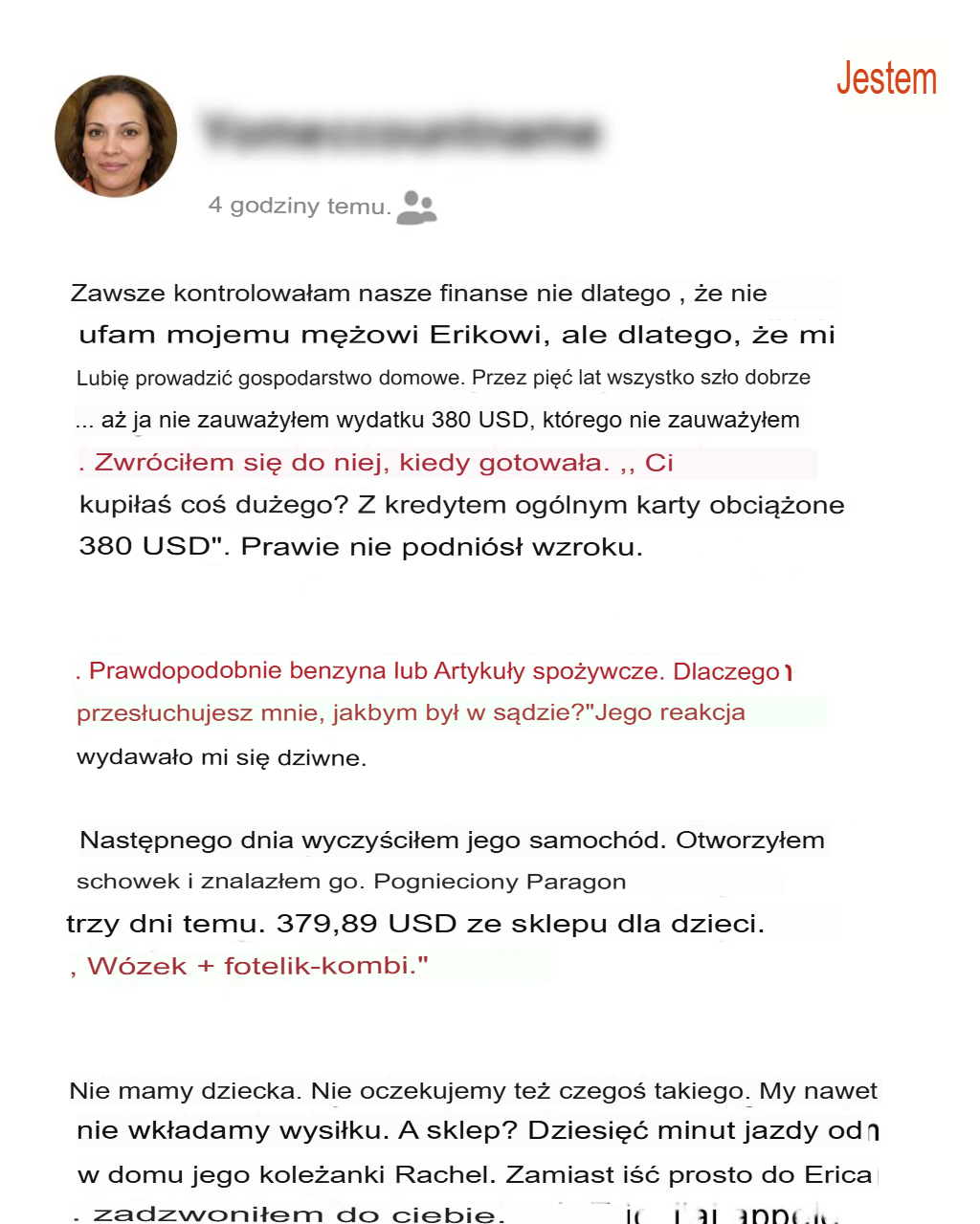 Budżetowanie to moja specjalność, dlatego śledzę wszystkie domowe transakcje. Kiedy mój mąż zrugał mnie za pytanie o wydatek, zaciekawiło mnie to. Kiedy znalazłam w jego samochodzie rachunek za wózek dziecięcy na kwotę 380 dolarów, przestałam zadawać pytania i zaczęłam łączyć kropki… ponieważ nie mamy dziecka.