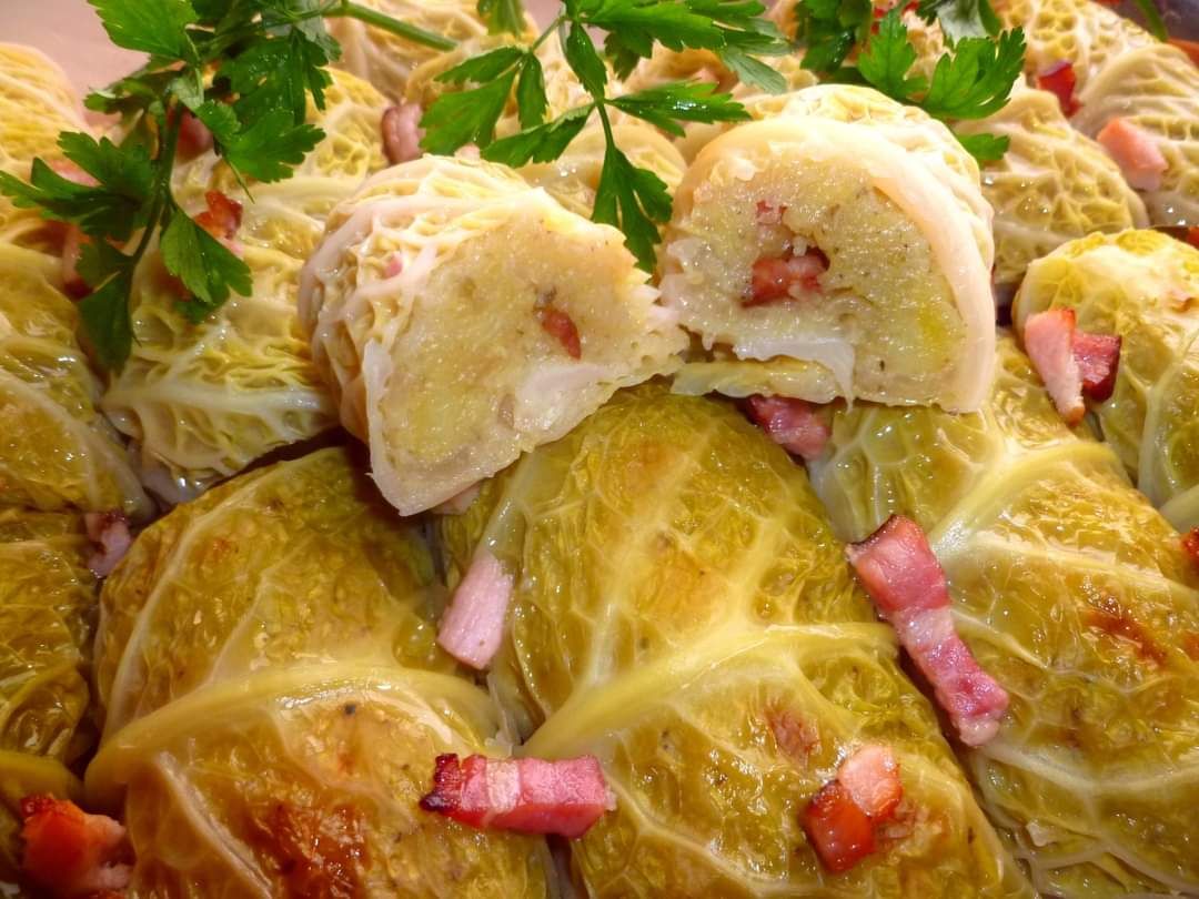 Obrane, umyte ziemniaki starłam na drobnych oczkach tarki, tak jak na placki. Starte ziemniaki przełożyłam na gęste sito – odcisnęłam z nadmiaru wody – wodę ziemniaczaną zostawiłam na ok 15 minut by na dnie miski osadziła się skrobia. Do odciśniętych ziemniaków dodałam jajko, przeciśnięte przez praskę ugotowane ziemniaki, letnią okrasę, majeranek, czosnek, sól, pieprz oraz skrobię która osadziła się na dnie naczynia z ziemniaczanej wody – dokładnie wymieszałam. Gotowy farsz zawinęłam w sparzone liście kapusty. Dno naczynia żaroodpornego 35 x 25 cm wyłożyłam sparzonymi liśćmi które zostały niewykorzystane do gołąbków. Liście włoskiej kapusty posypałam kapustą kiszoną.