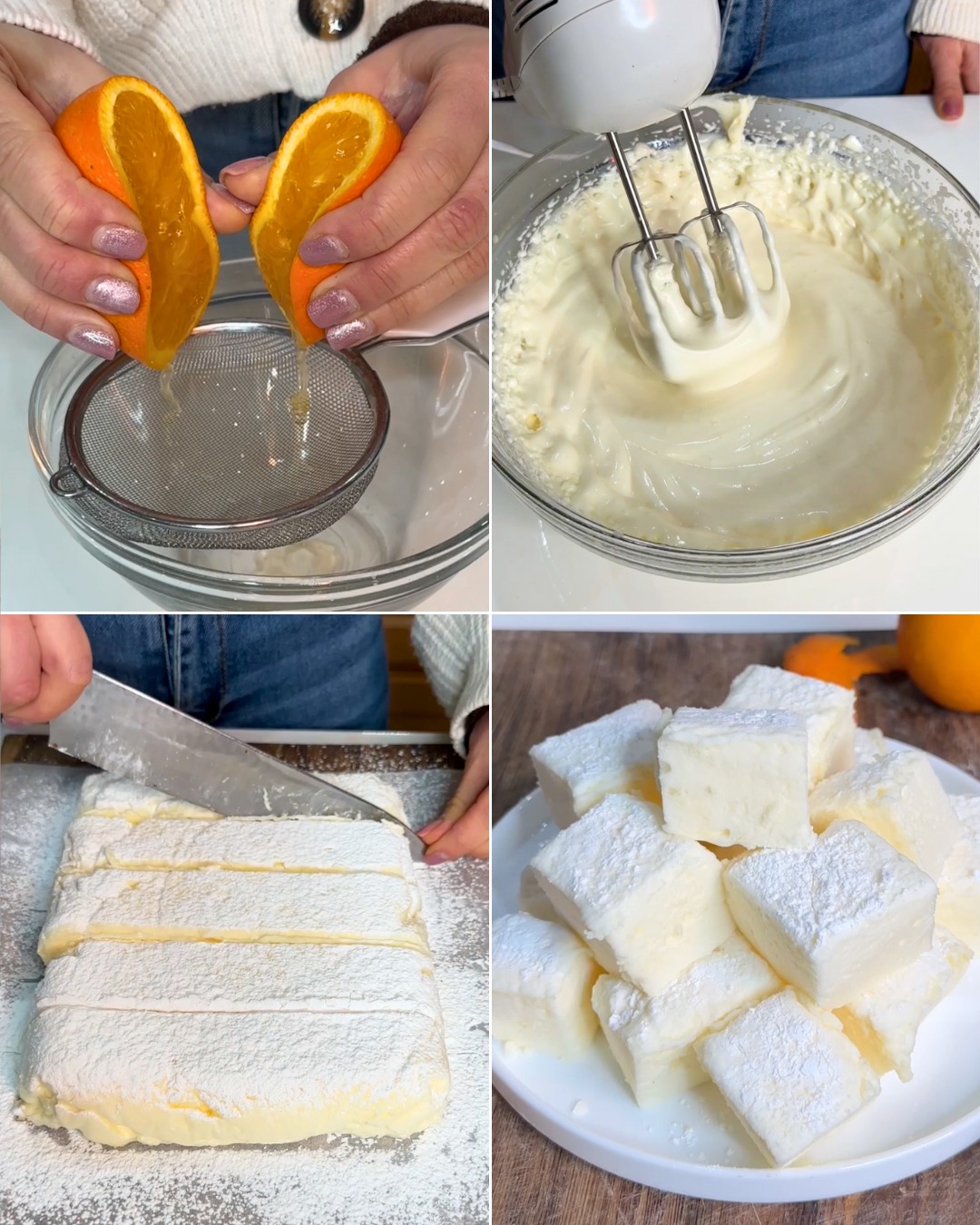 Marshmallows to typowe amerykańskie słodkie słodycze, a dziś przygotujemy je tylko z 2 składników: żelatyny i soku pomarańczowego. Te miękkie i pyszne pomarańczowe pianki marshmallow są łatwe do wykonania: wystarczy rozpuścić arkusze żelatyny w soku pomarańczowym, zmiksować wszystko na puszystą masę, przelać do formy i pozostawić do ostygnięcia w lodówce. Oto jak je przygotować!