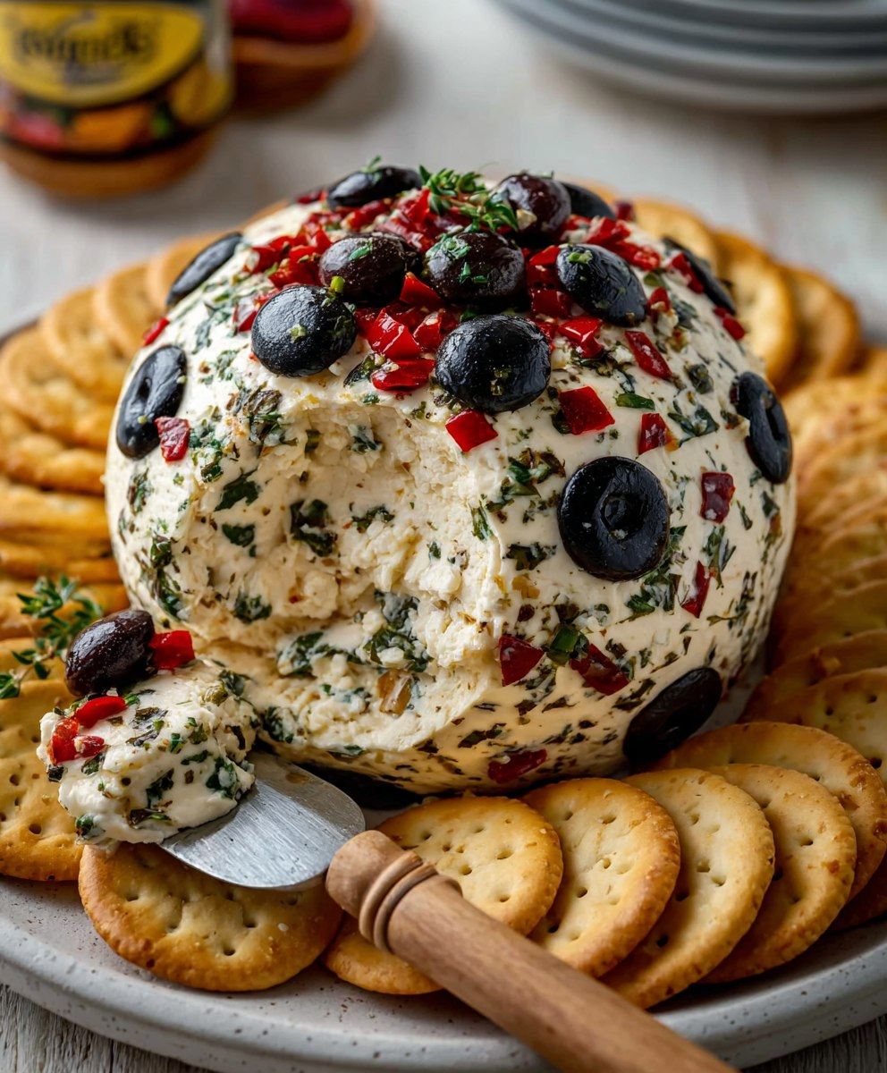 Ta inspirowana kuchnią śródziemnomorską kulka serowa z oliwkami to idealna przystawka dla każdego. Łączy kremowy ser z wyrazistymi smakami czarnych oliwek, pieczonej czerwonej papryki i świeżych ziół. Idealna na przyjęcia, ta elegancka przystawka zajmuje zaledwie kilka minut i stanowi żywą ozdobę każdego spotkania.