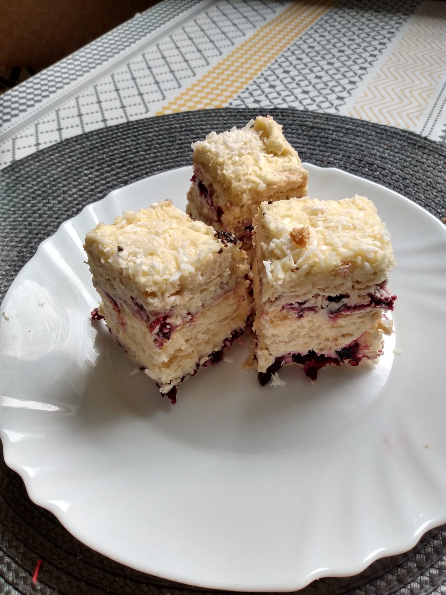 Delikatne kokosowe warstwy przełamane kwaskowatym dżemem porzeczkowym – idealne na każdą okazję! 🥰