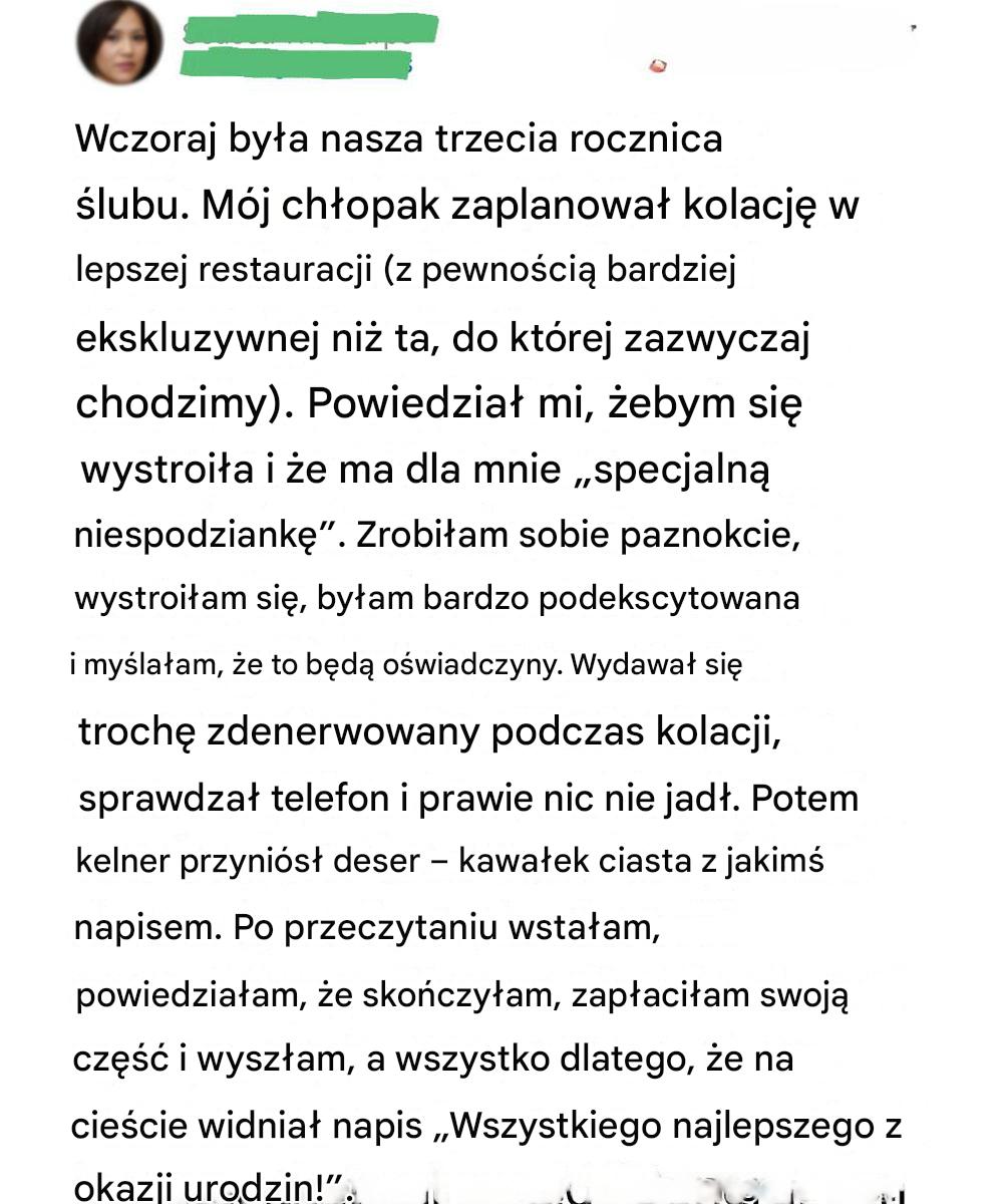 Zarezerwował nawet stolik na kolację w eleganckiej restauracji w centrum miasta i powiedział mi, żebym ubrała się elegancko, bo czeka na mnie „specjalna niespodzianka”.