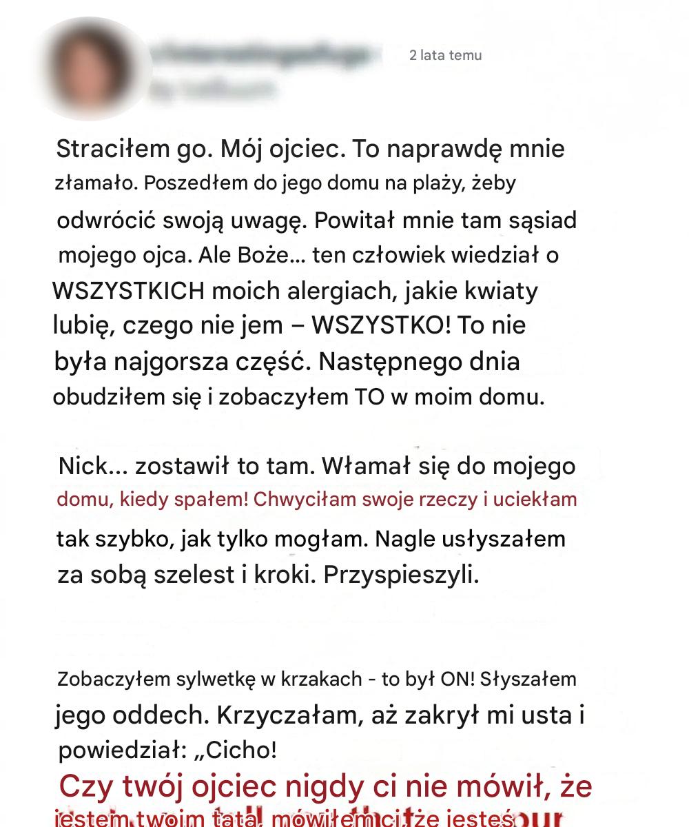 Po śmierci ojca wynajęłam dom na plaży w cichym nadmorskim miasteczku, gdzie zawsze mógł się schronić przed zgiełkiem miasta. Chciałam, żeby to była uzdrawiająca podróż – sposób na poczucie się bliżej mężczyzny, który mnie wychował. Dom był dokładnie taki, jak go opisał: ciepły, spokojny i otoczony kwitnącymi kwiatami.
