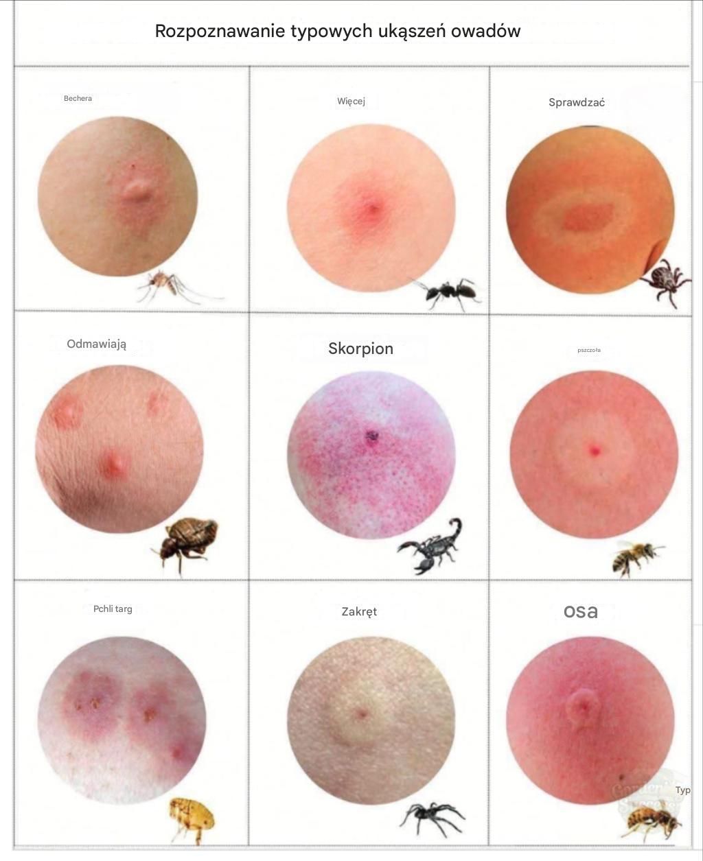 Ukąszenia owadów wyglądają inaczej. Rozpoznanie ich może prowadzić do szybszego leczenia i większego bezpieczeństwa. Krótki przegląd: Komar: Wypukły, swędzący guzek po jednym ukąszeniu. Mrówka: Mała, czerwona, czasami bolesna plamka. Kleszcz: Czerwony, często płaski guzek w kształcie rombu. Pluskwa: Czerwone guzki ułożone w rzędach.![]()