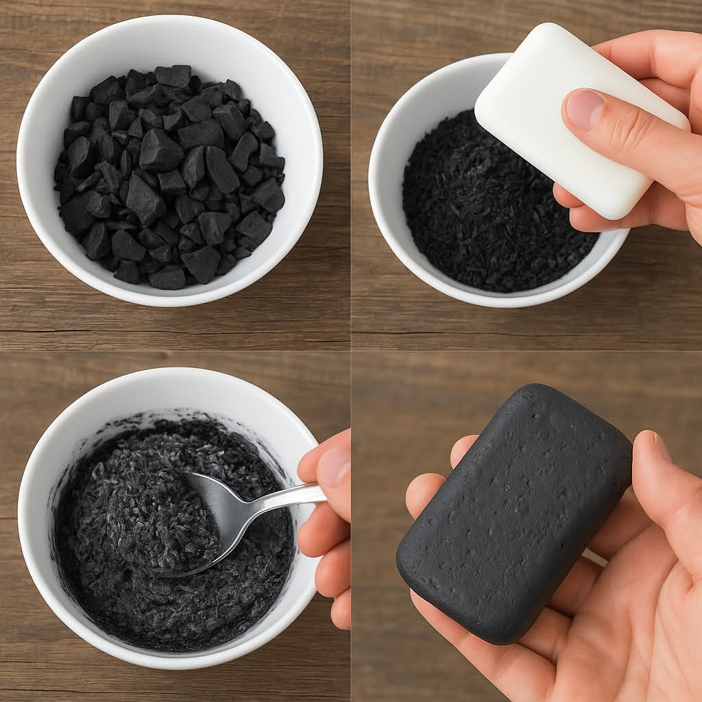 - Wymieszaj składniki : włóż mydło glicerynowe i węgiel drzewny do miski. Stopniowo dodawaj gorącą wodę i mieszaj, aż powstanie gładka pasta.