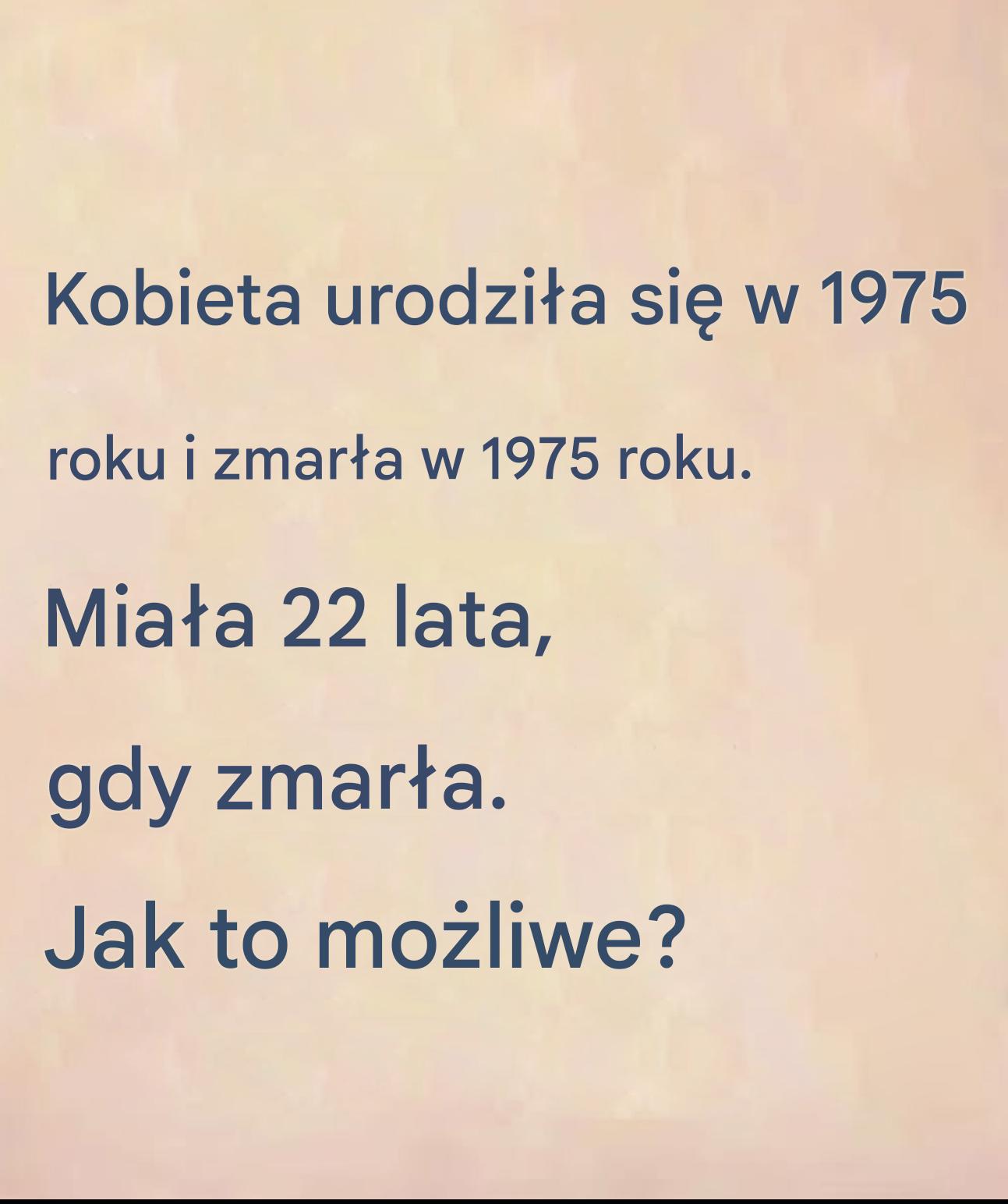 Wyobraź sobie: przeglądając aktualności, natrafiasz na to dziwne zdanie. „Kobieta urodziła się w 1975 roku i zmarła w 1975 roku. Miała 22 lata”. Zatrzymuje cię w miejscu. Niezrozumiałe? Niepokojące? Oczywiście, gdzieś jest haczyk… Ale gdzie? Trzymaj się mocno, bo ta zagadka wystawia na próbę naszą logikę, nasze odruchy i wymaga odrobiny wyobraźni. A co, jeśli kluczem jest właśnie to, żeby nie myśleć w zwykły sposób?